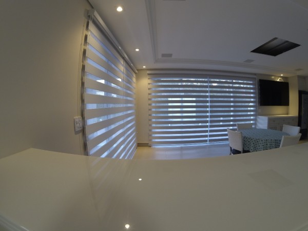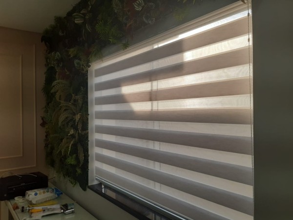 Esse modelo de persiana possui duas faixas intercaladas , sendo uma de tecido e outra de tela e a quantidade de tecido também é duplicada, pois quando são acionadas, criam um movimento e efeito maravilhoso, permitindo que os tecidos se intercalem oferecendo um efeito lúdico tornando o ambiente mais agradável.